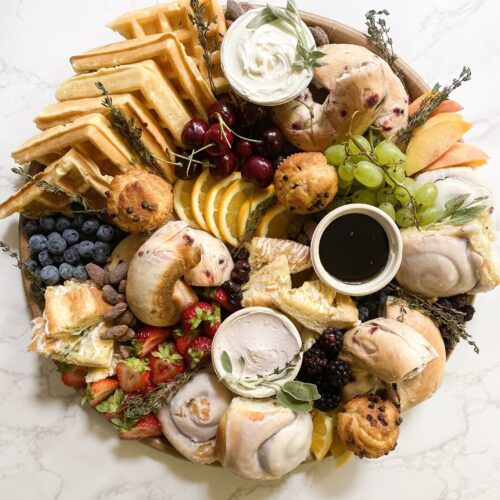 Cheese and Charcuterie Boards consist of a variety of hand selected specialty cheeses, assorted charcuterie meats, seasonal fresh fruits and vegetables, assorted artisanal crackers and a variety of spreads, honey and accoutrements such as olives, pickles, nuts, and chocolate. Fresh herbs are always used as garnish.